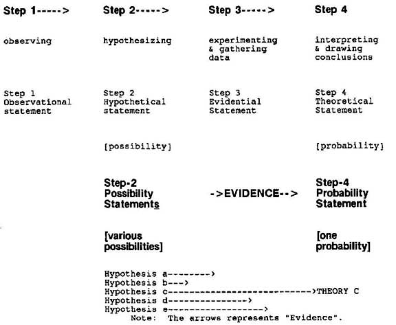 In Step 2, different possible explanations or hypotheses [a,b,c,d,e] are advanced to explain the initial observation in Step 1. Then in Step 3, the formulating of "tests" and the collecting of data (evidence) are performed in order to weed out/eliminate competing explanations (hypotheses) until only one emerges (in light of all relevant evidence) as the most probable explanation (at Step 4) for any given phenomenon, observation or experience. See also Possibility versus Probability
