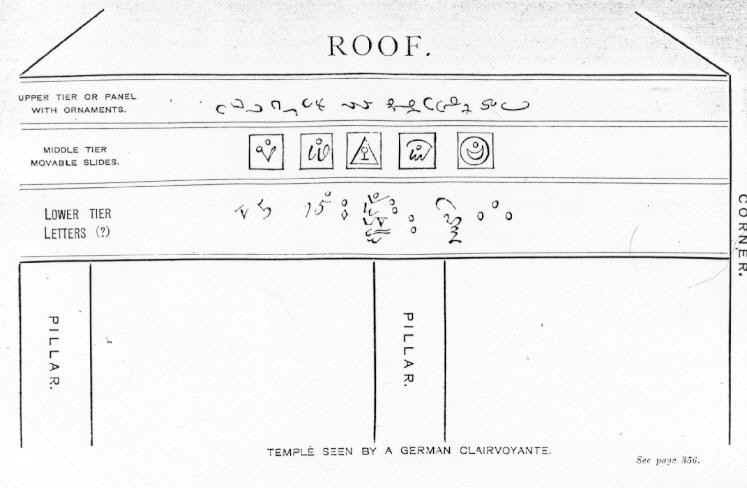V. Now with a heart full of said misgivings and forebodings of evil tidings, I handed her the "occult letter". Her first exclamation was one of surprise, wonder and joy. "Ah!" --- she exclaimed; --- "What is this? I never saw anything so beautiful in my life! (8) I see before me a high but artificially made elevation or hill, and upon that hill a building which looks like a temple, with a high Chinese roof. The temple is of a splendid white, as if it were made of pure white marble, and the roof is resting upon three pillars. On the top of a roof there is a shining sun; --- but no! --- it only looks like a sun; it seems to be some kind of an animal. (9) I do not know how to describe it; I never saw such a thing before; but it shines like a sun.